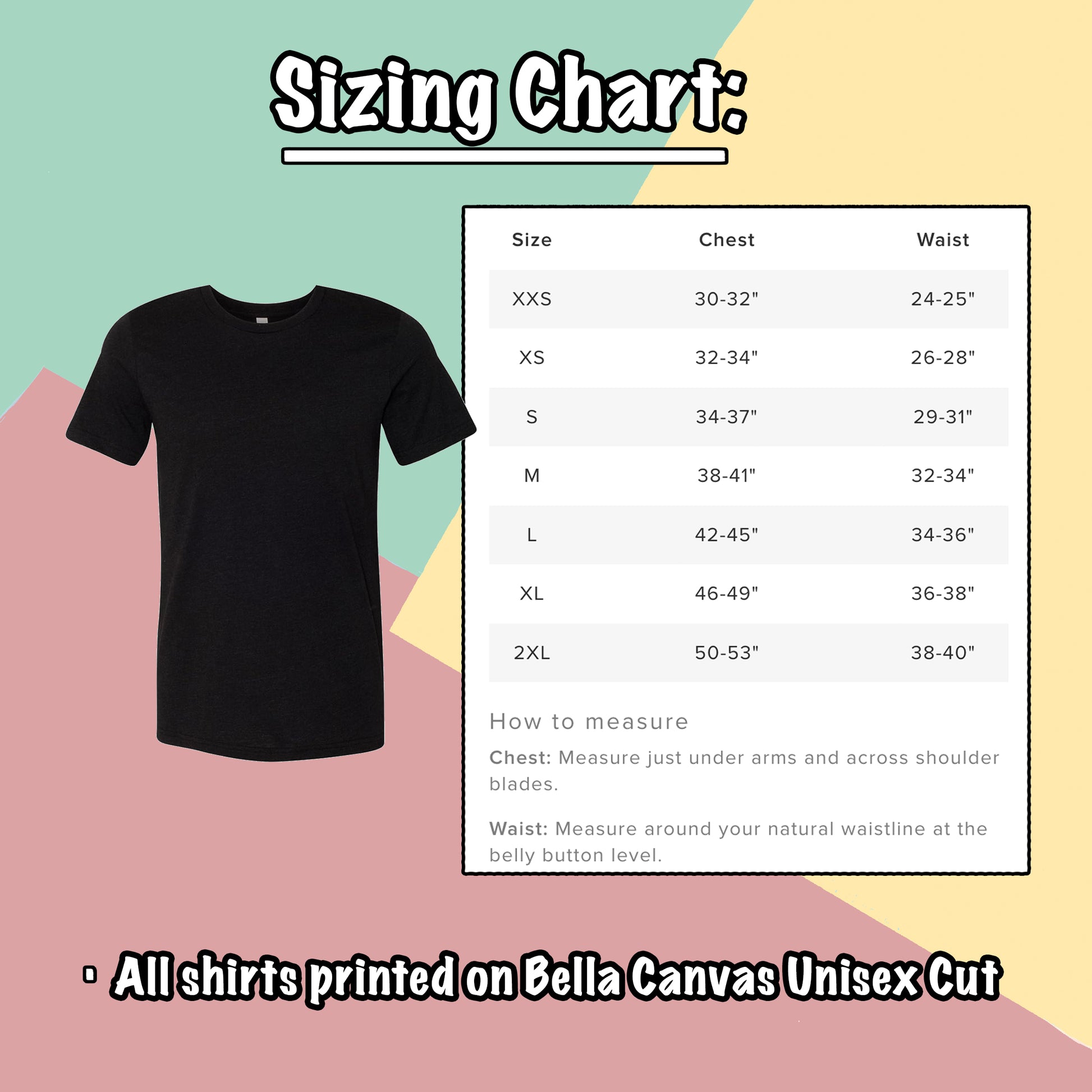 Be sure to check the sizing chart in the final image. All designs are pressed on Bella Canvas Unisex 100% cotton t-shirts in black. Some variation may result as these shirts are hand pressed.
