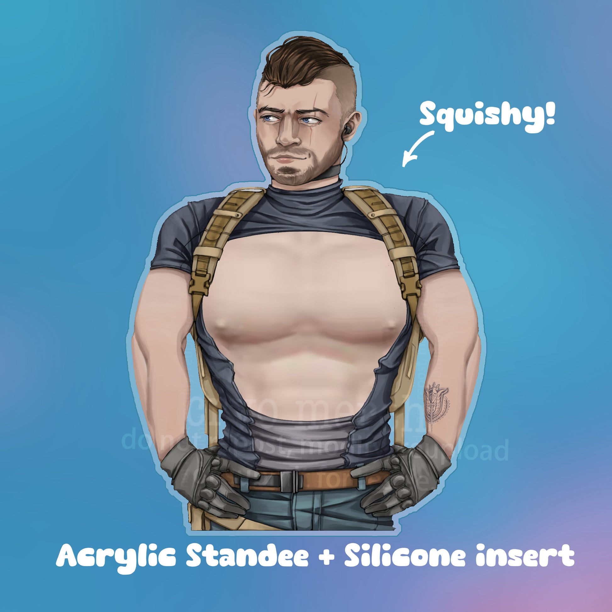 An approximately 5" Acrylic standee with a squishy silicone insert. Artwork is printed on the top layer with a spacer and a plastiboard backer to hold the soft silicone insert. These are wide enough to stand on their own, with a blank back side.